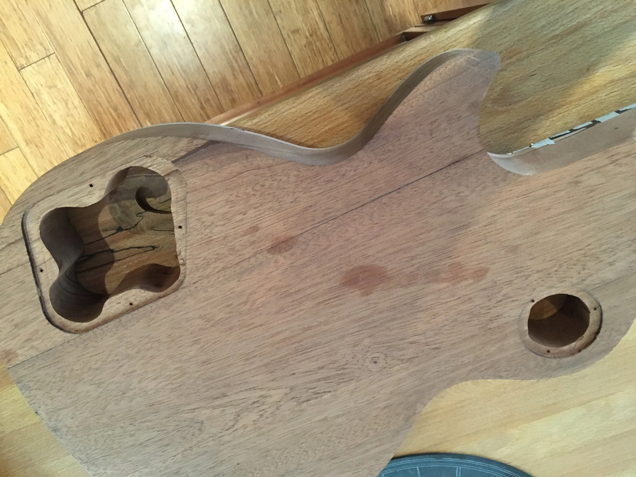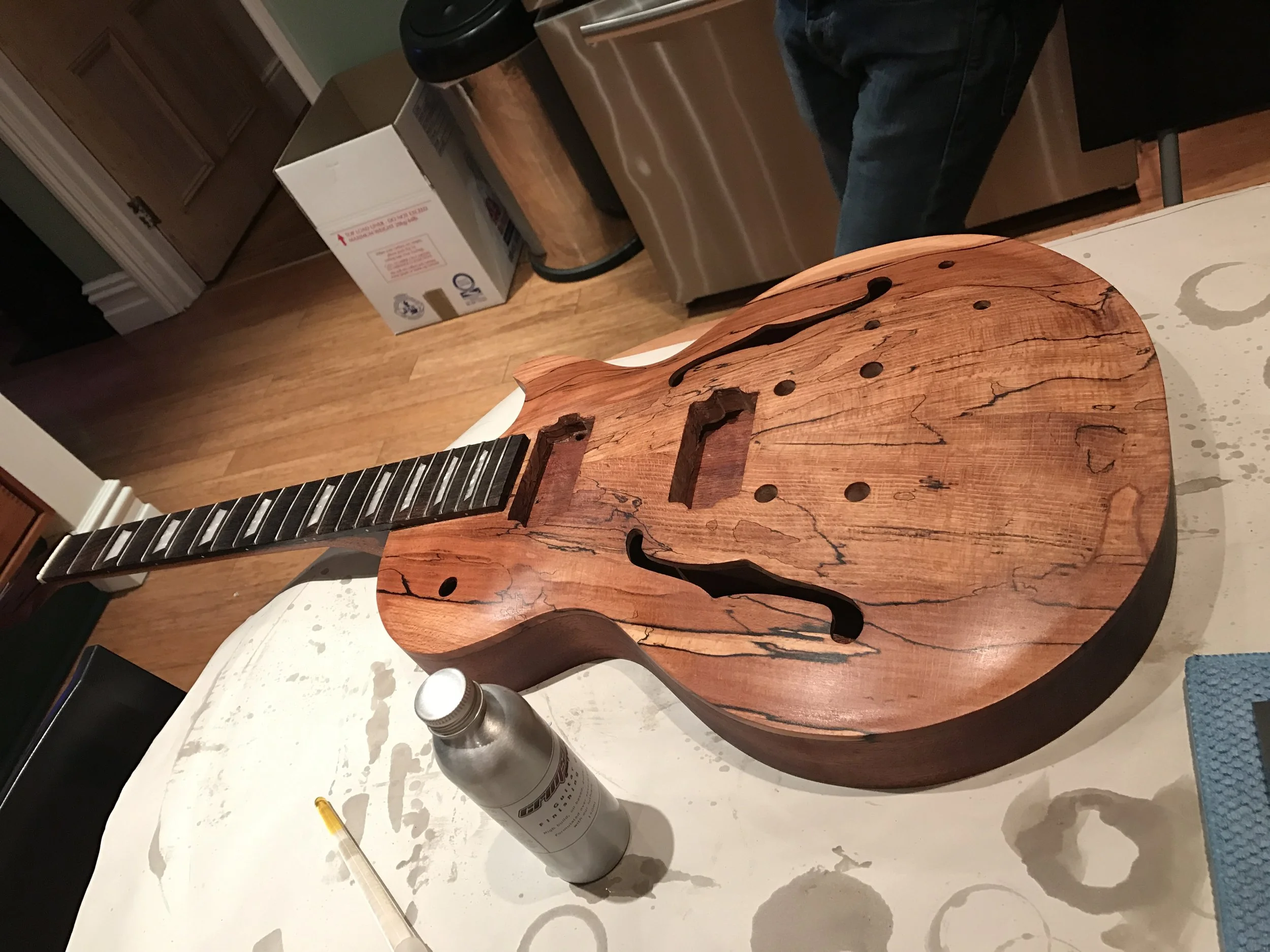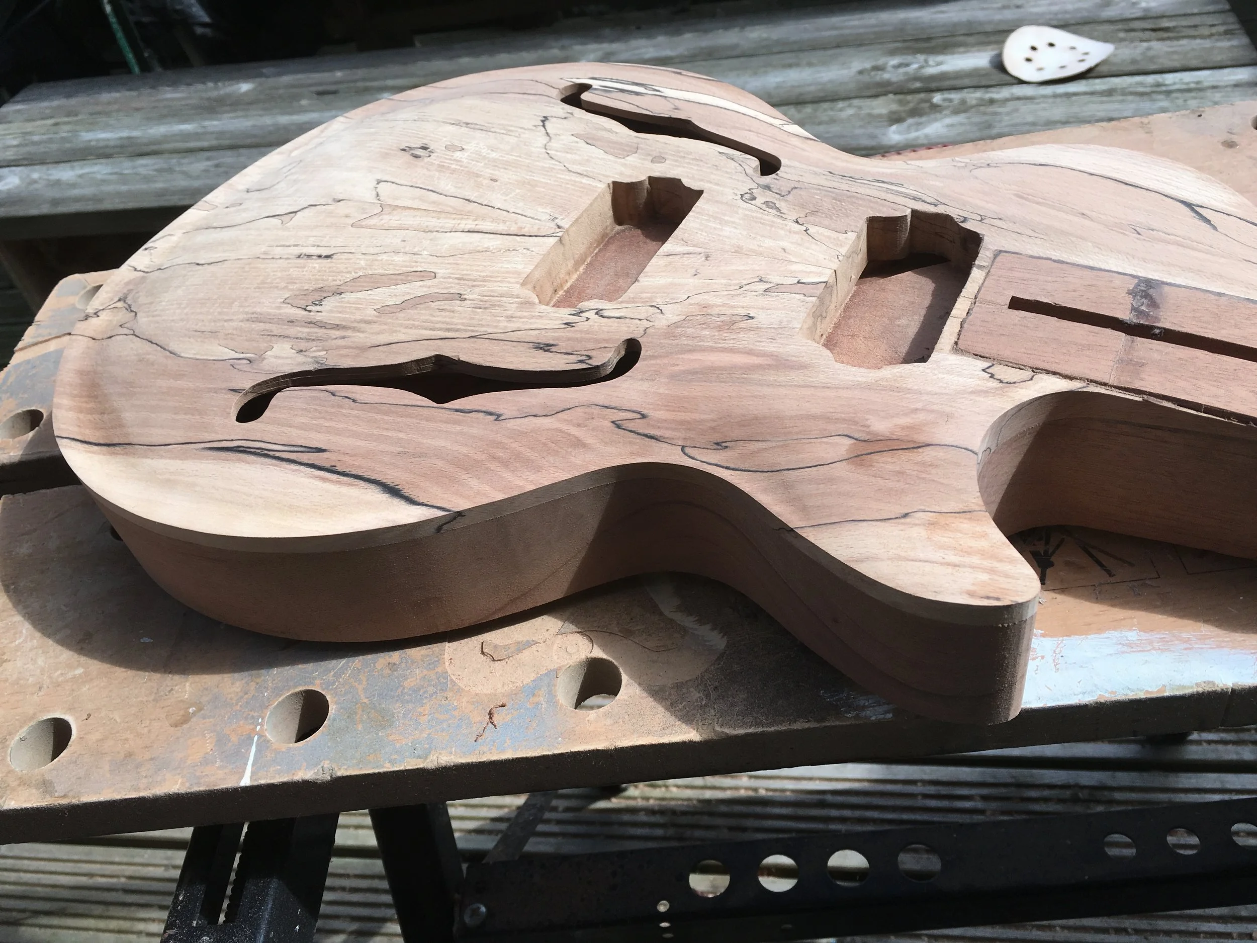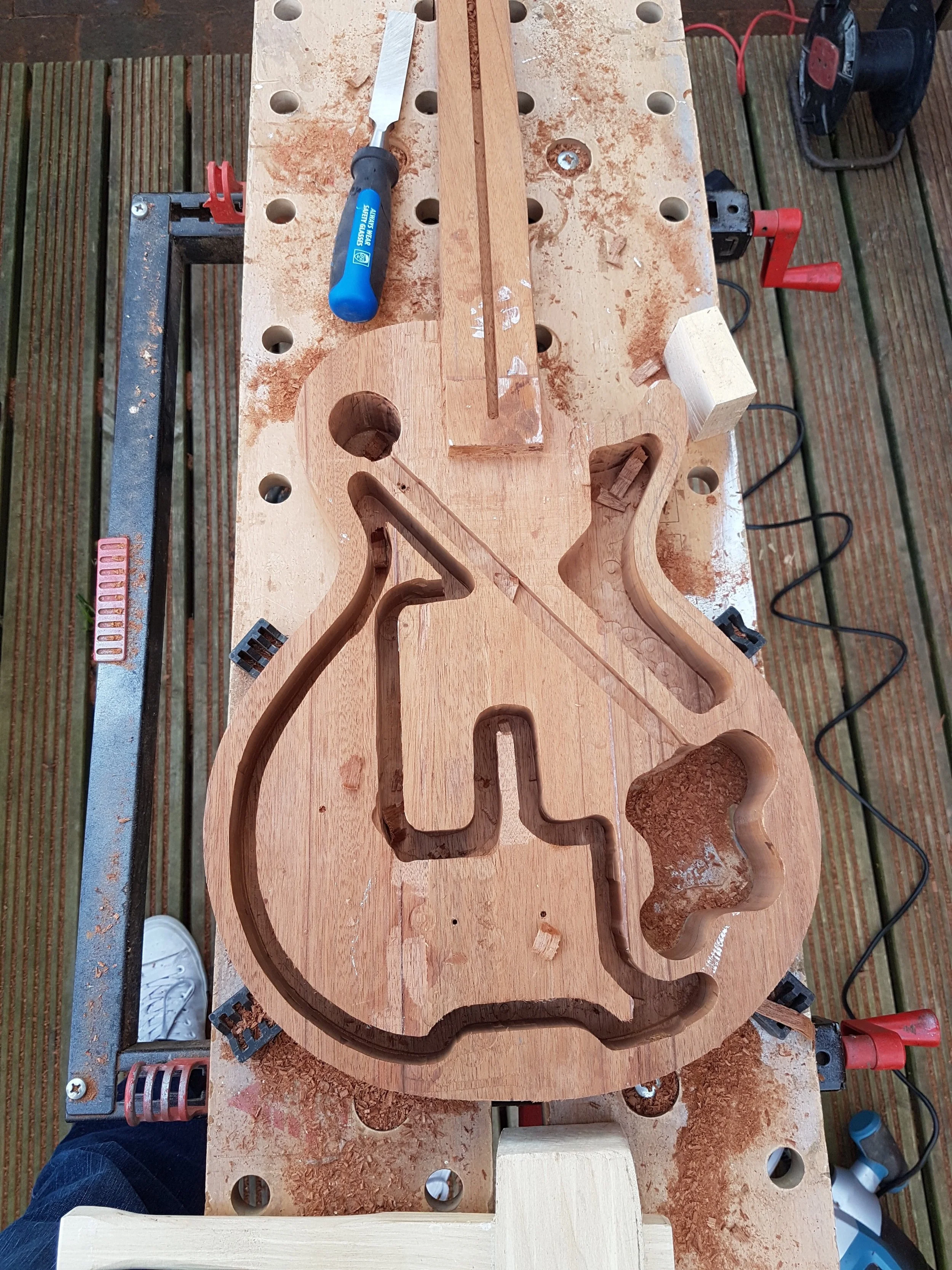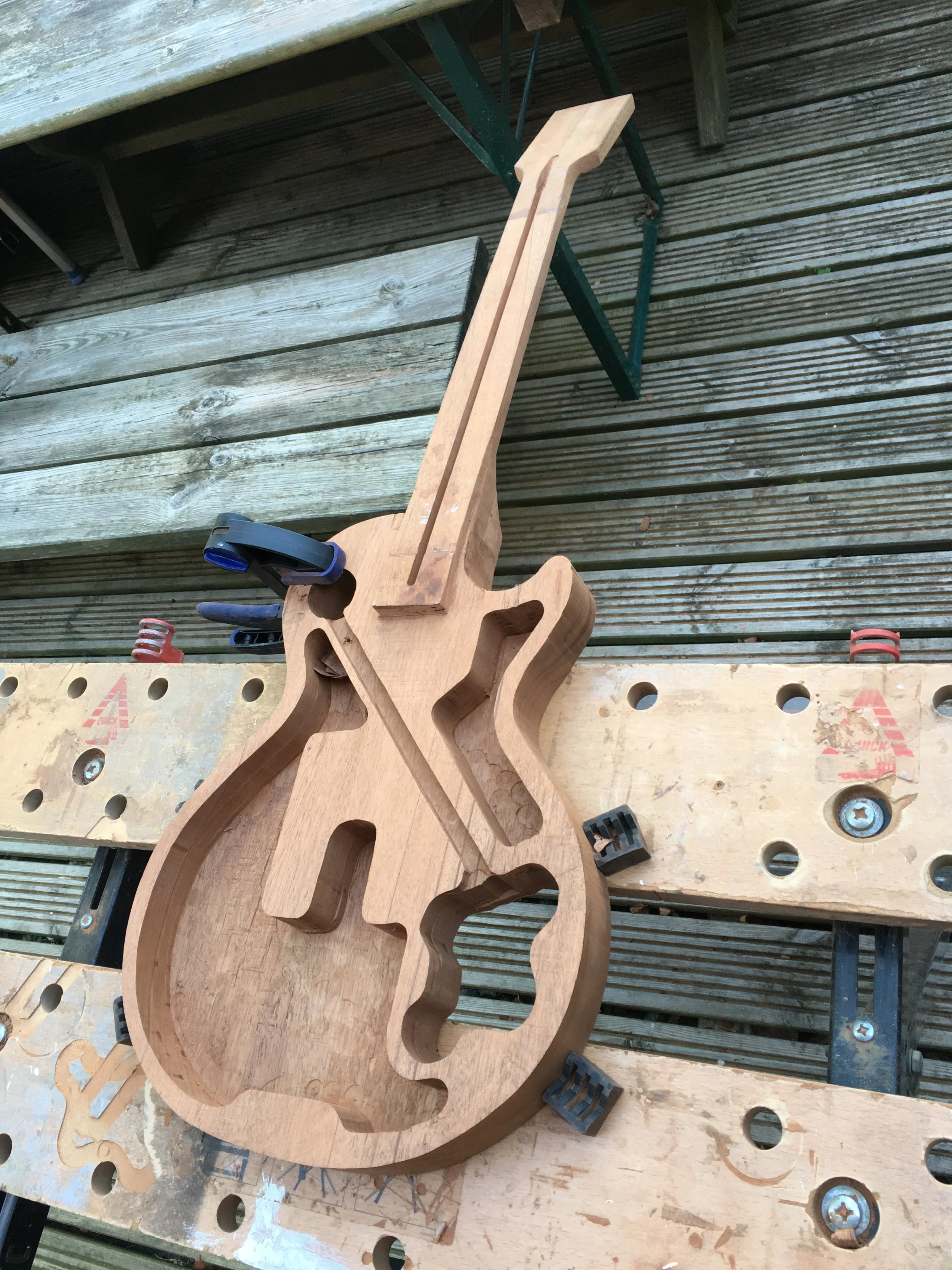 This project began my love of woodworking. Made using a through-body solid mahogany body and neck and a quilted book-matched ash top. The guitar was finished with second-hand Epiphone hardware.