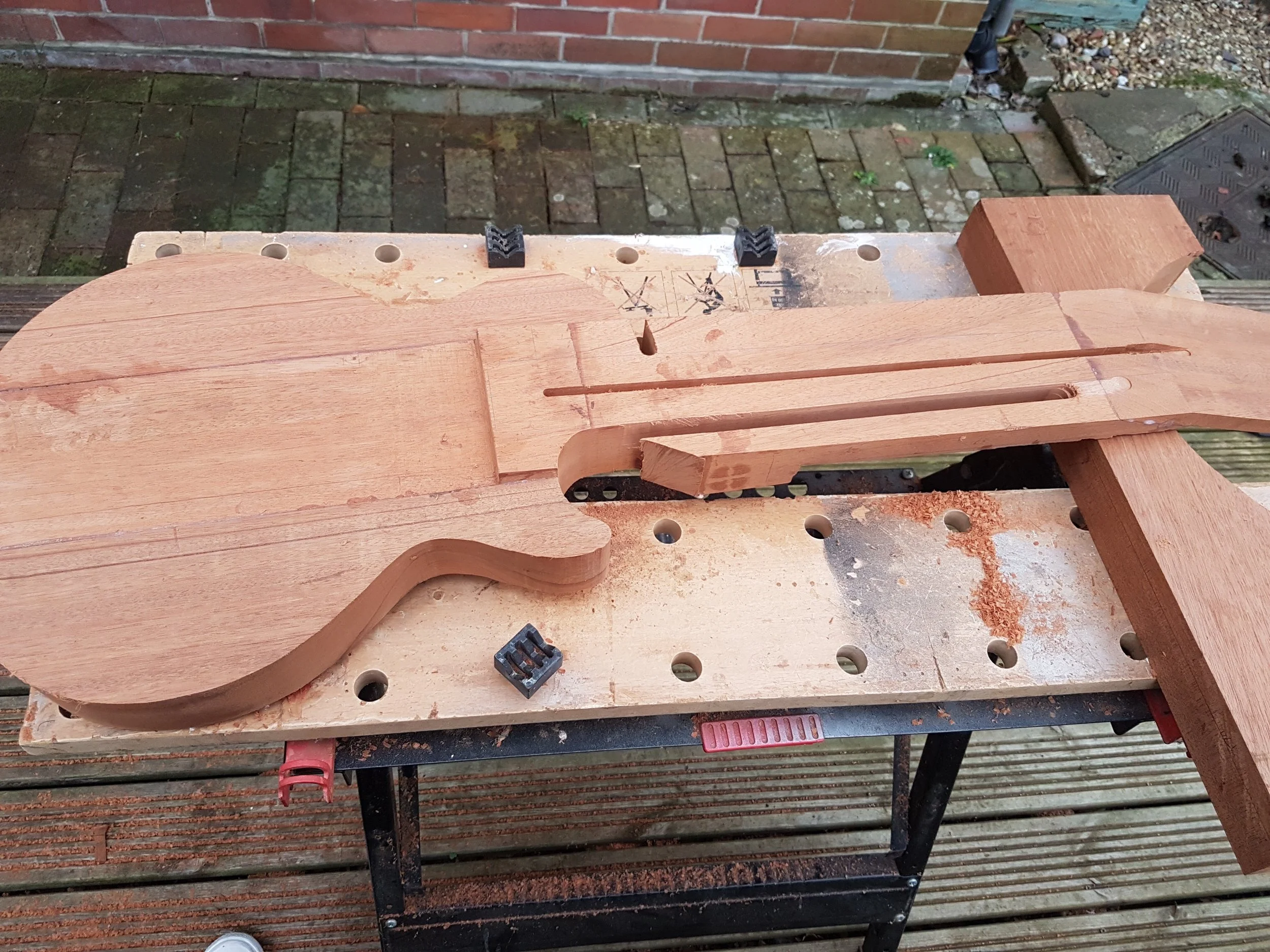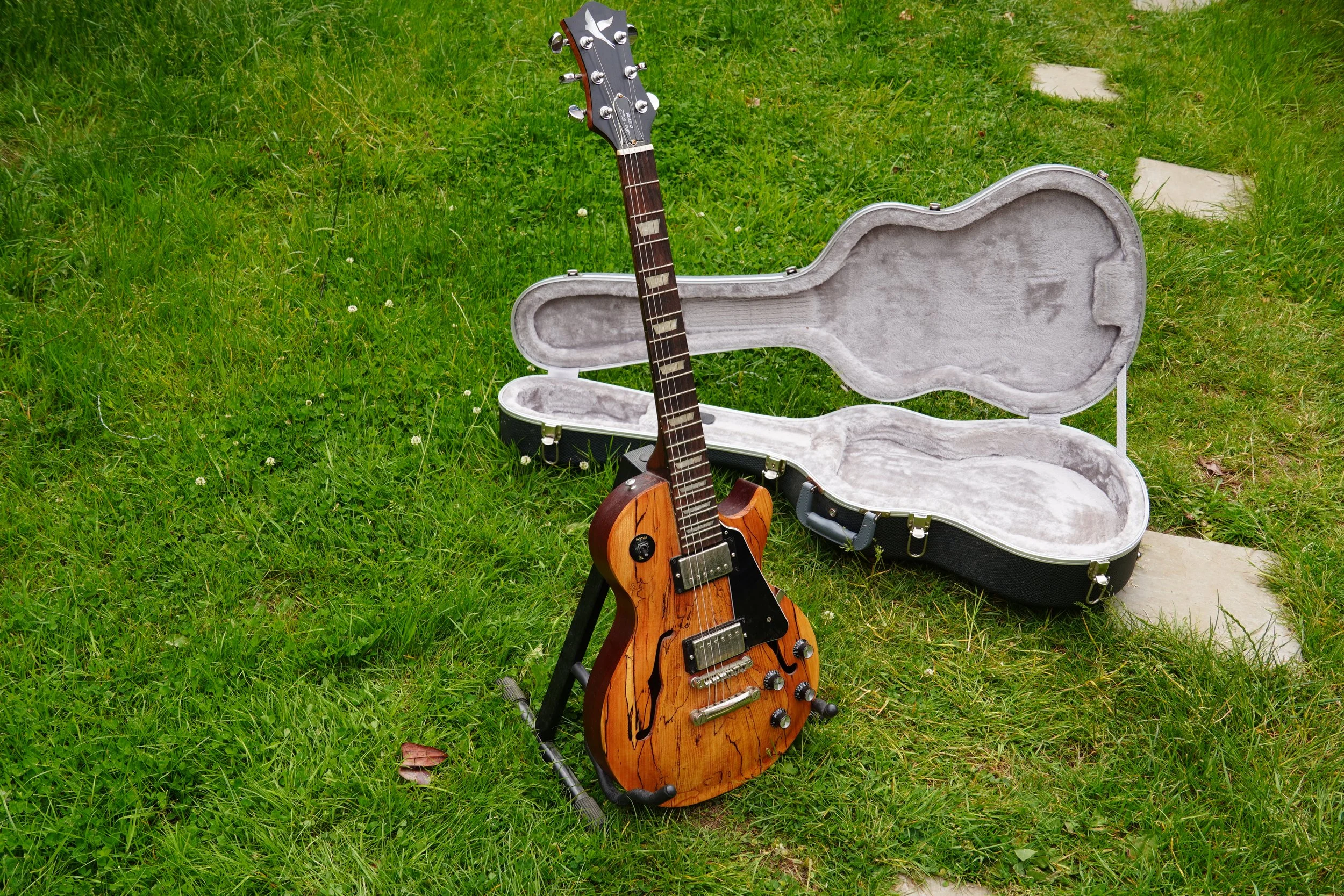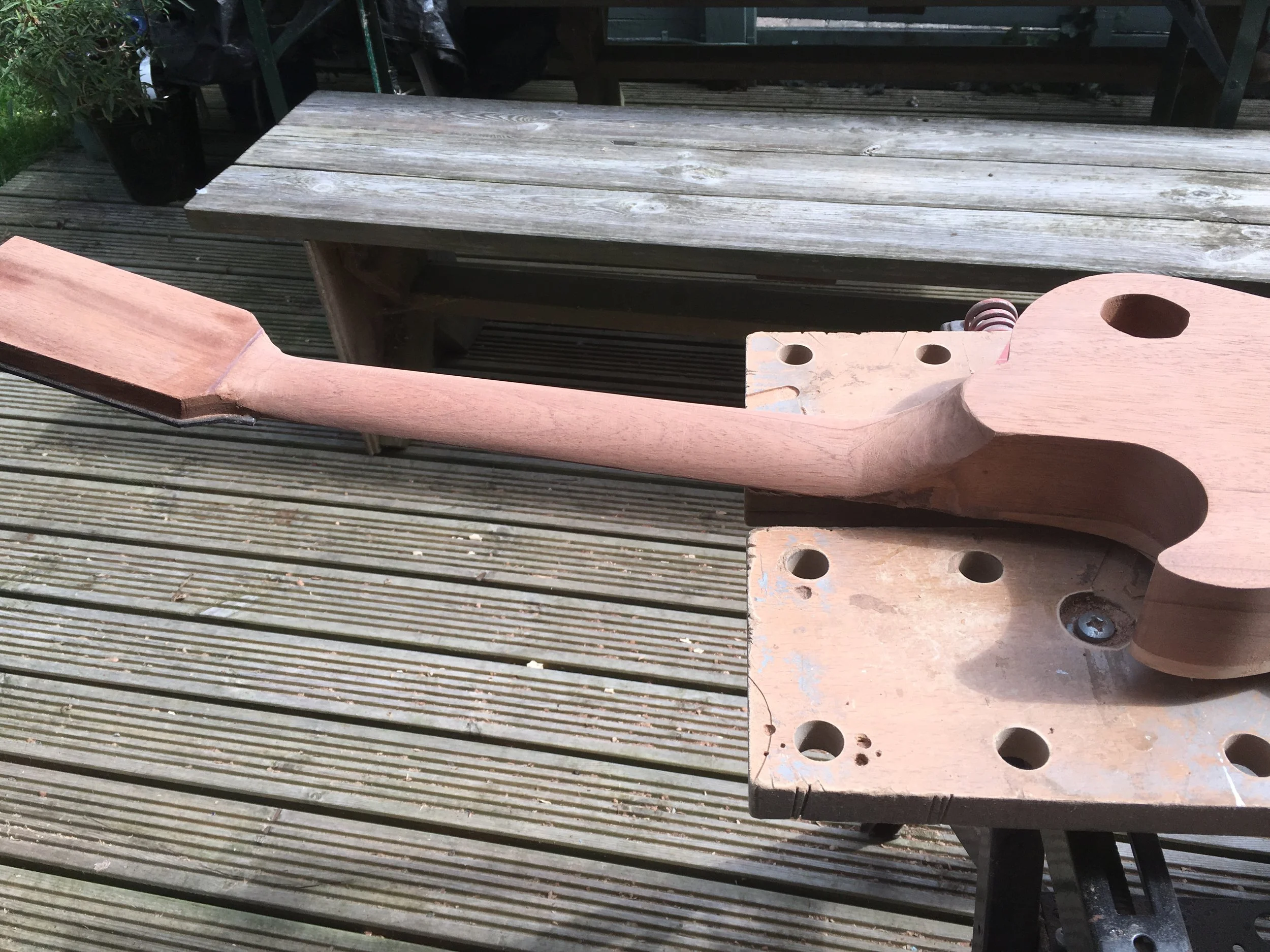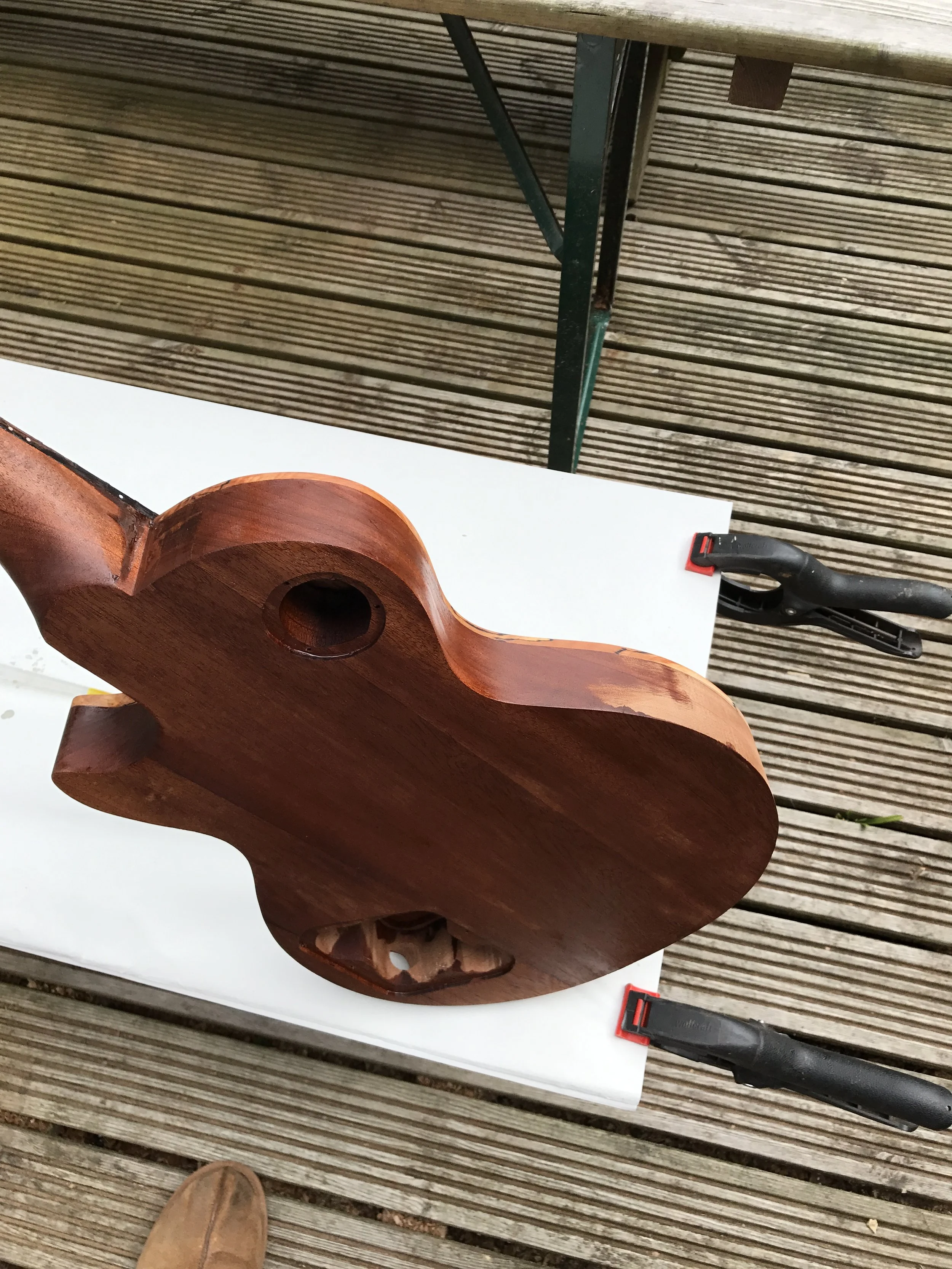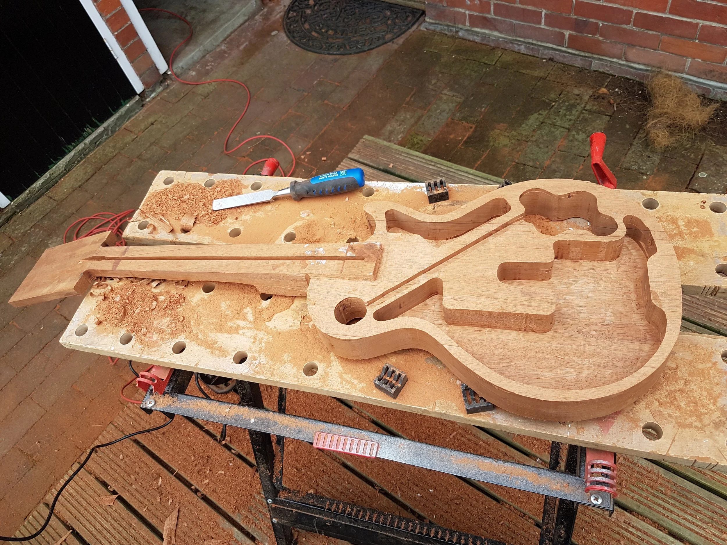 This project began my love of woodworking. Made using a through-body solid mahogany body and neck and a quilted book-matched ash top. The guitar was finished with second-hand Epiphone hardware.
