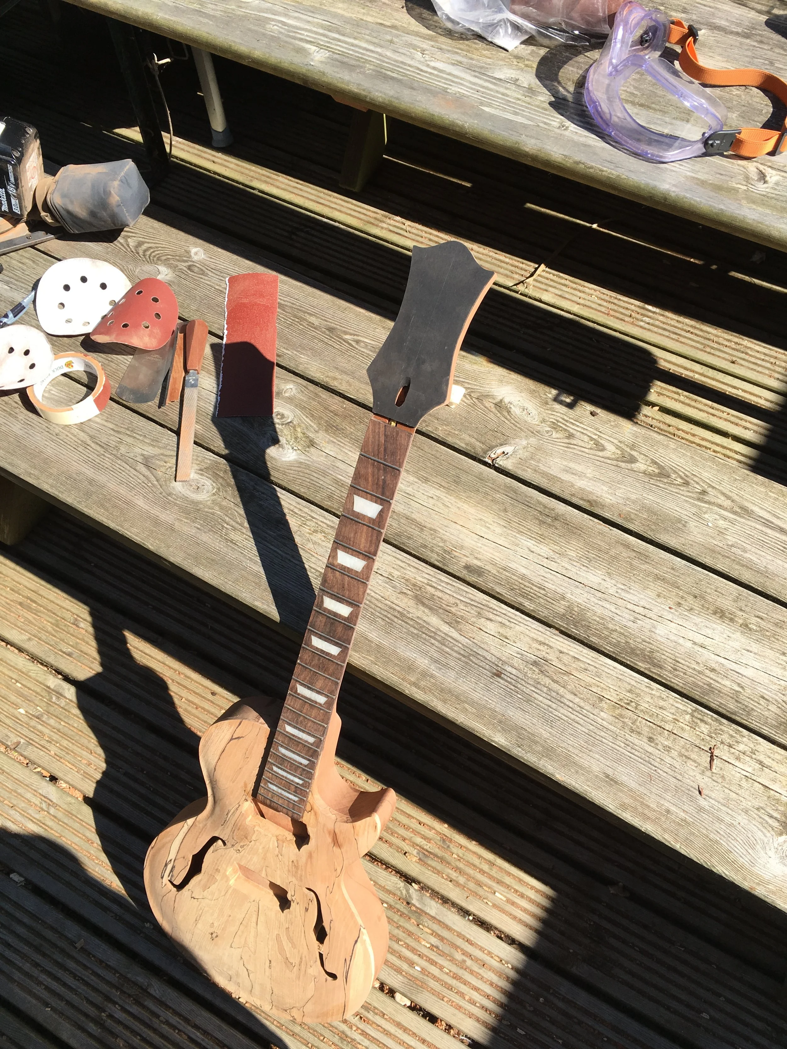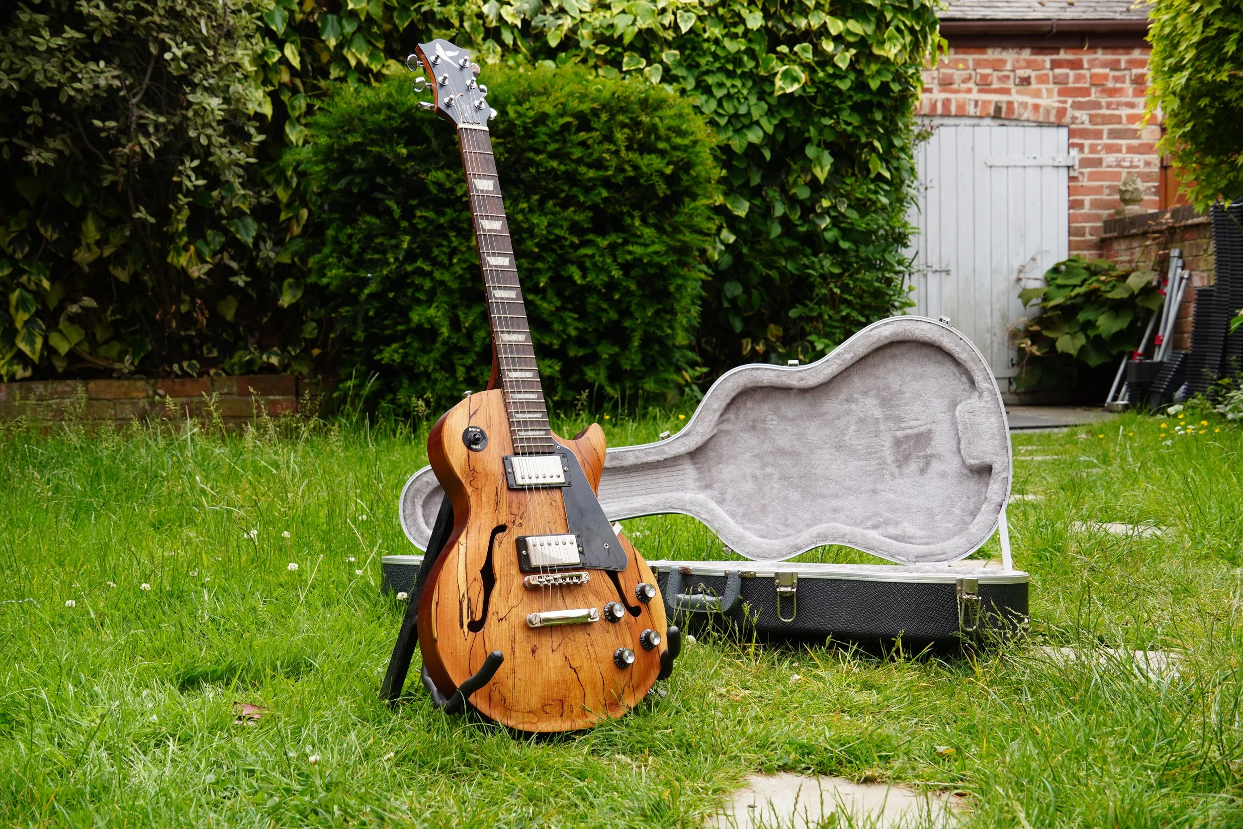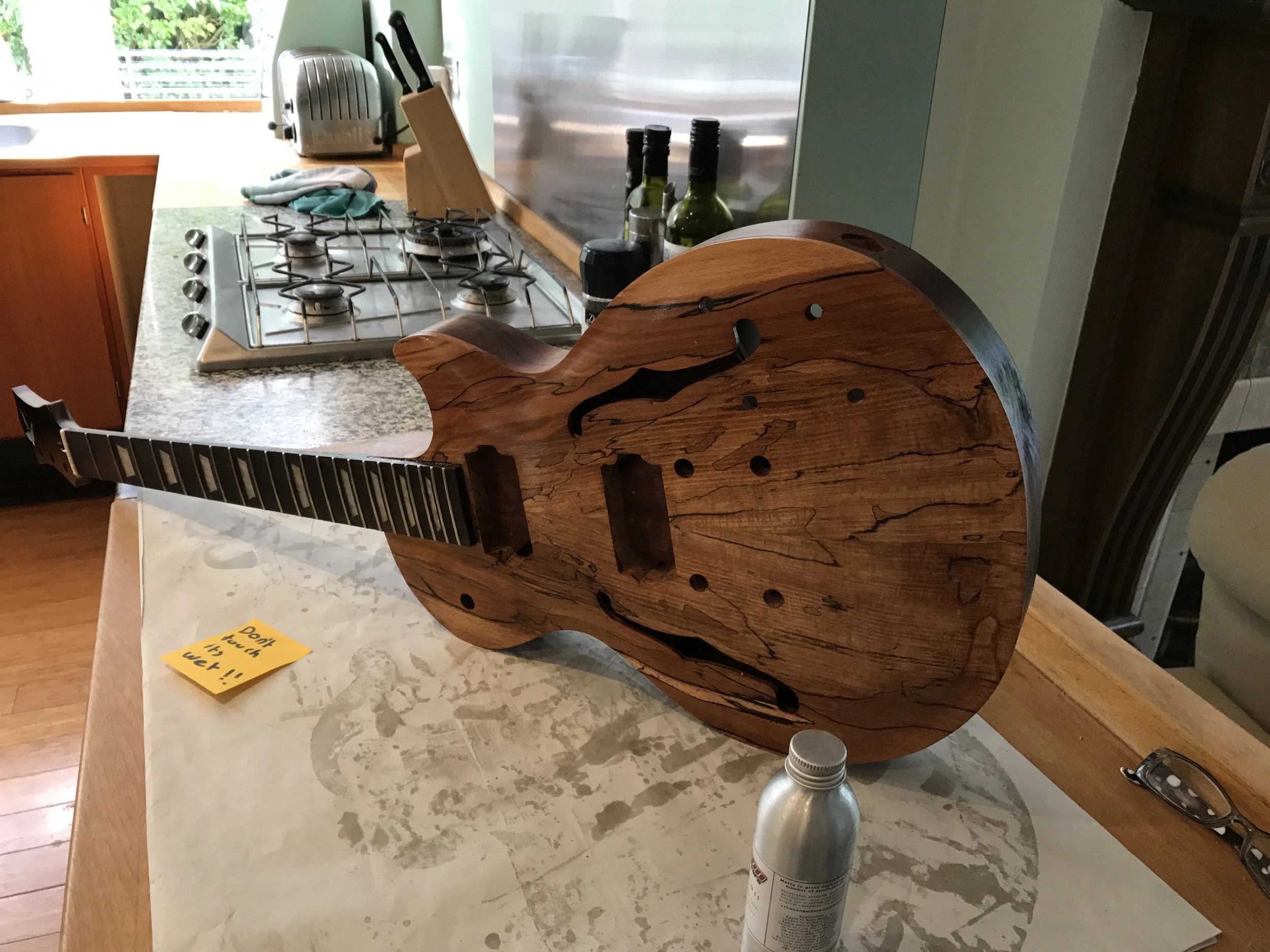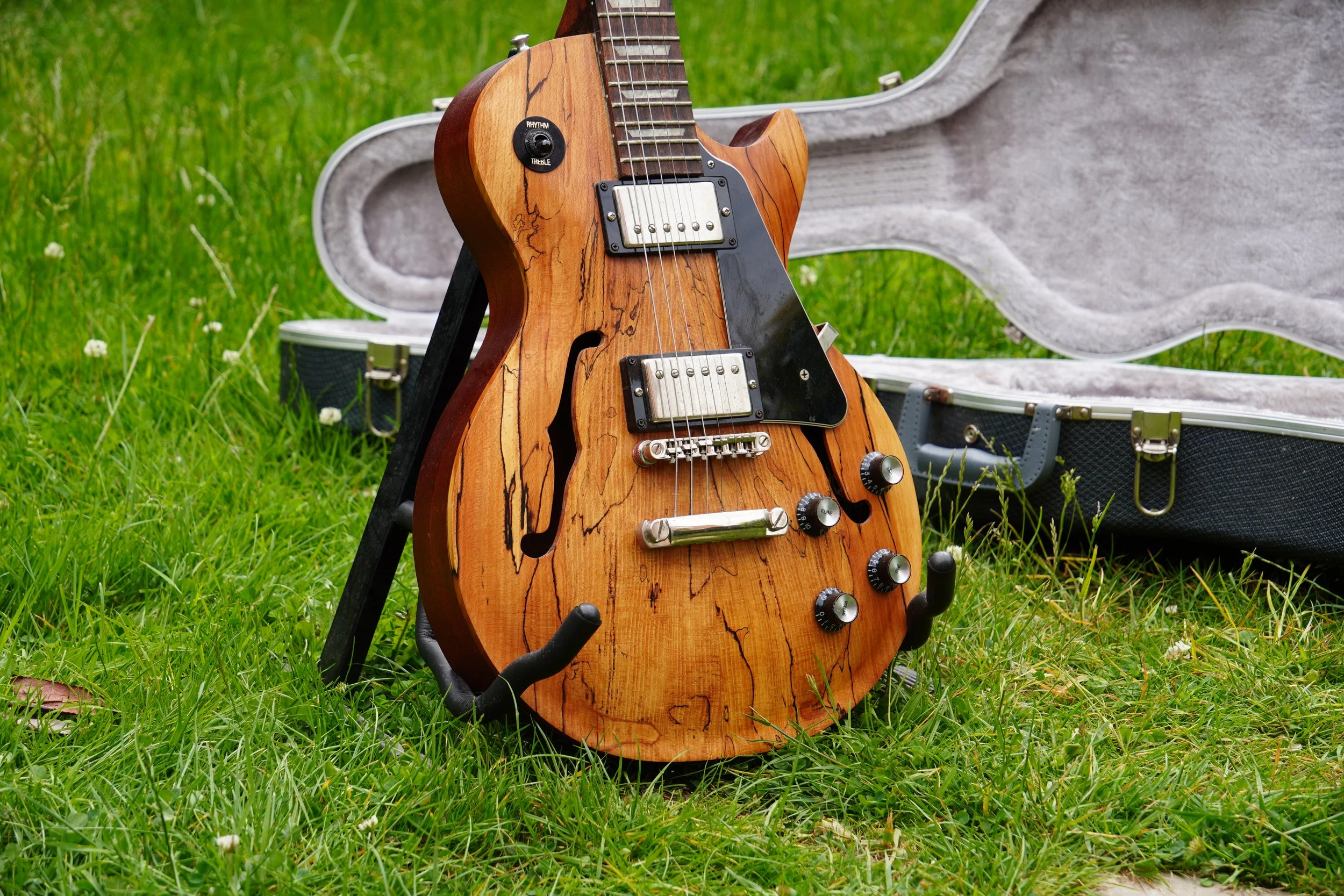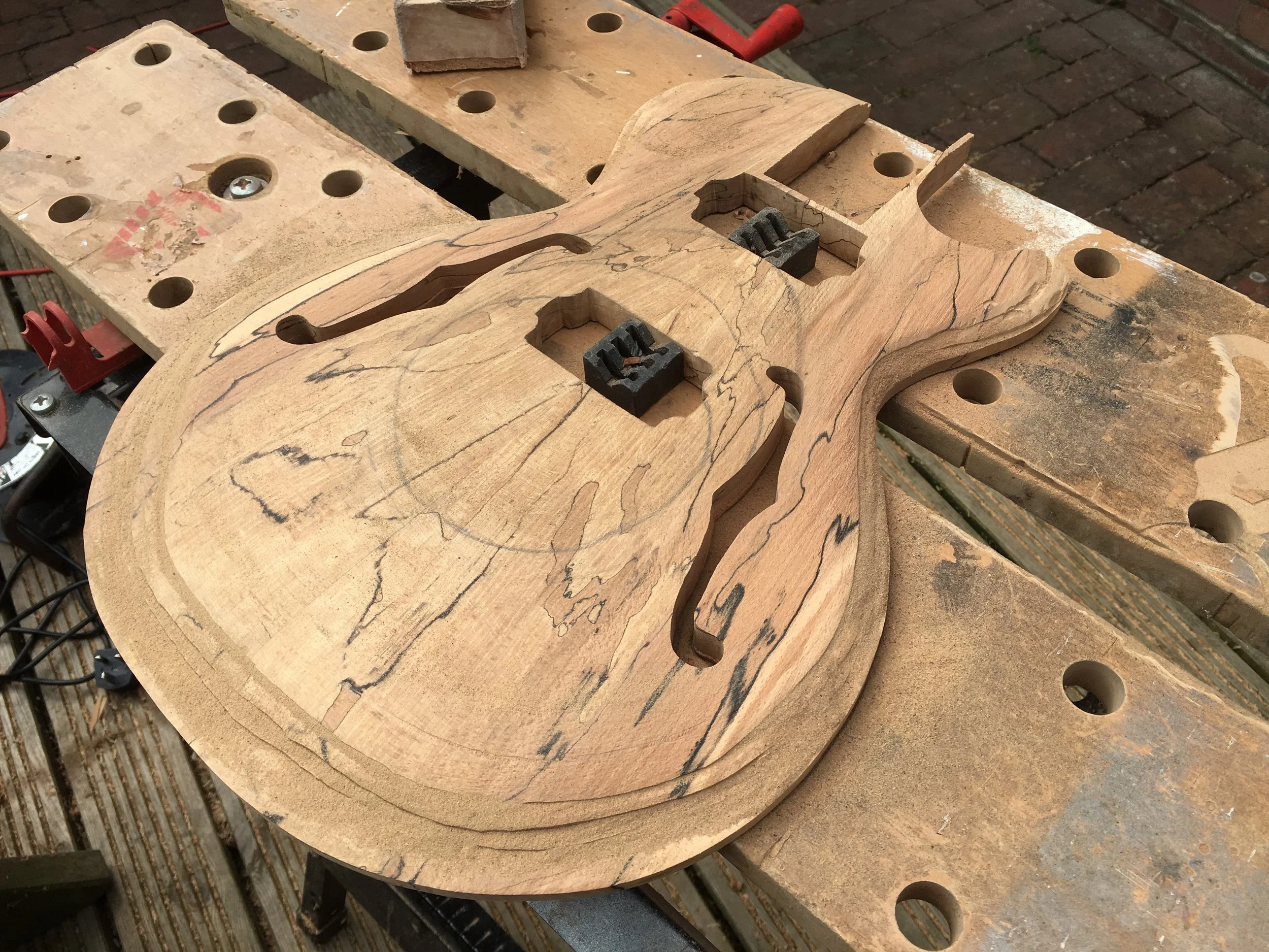 This project began my love of woodworking. Made using a through-body solid mahogany body and neck and a quilted book-matched ash top. The guitar was finished with second-hand Epiphone hardware.
