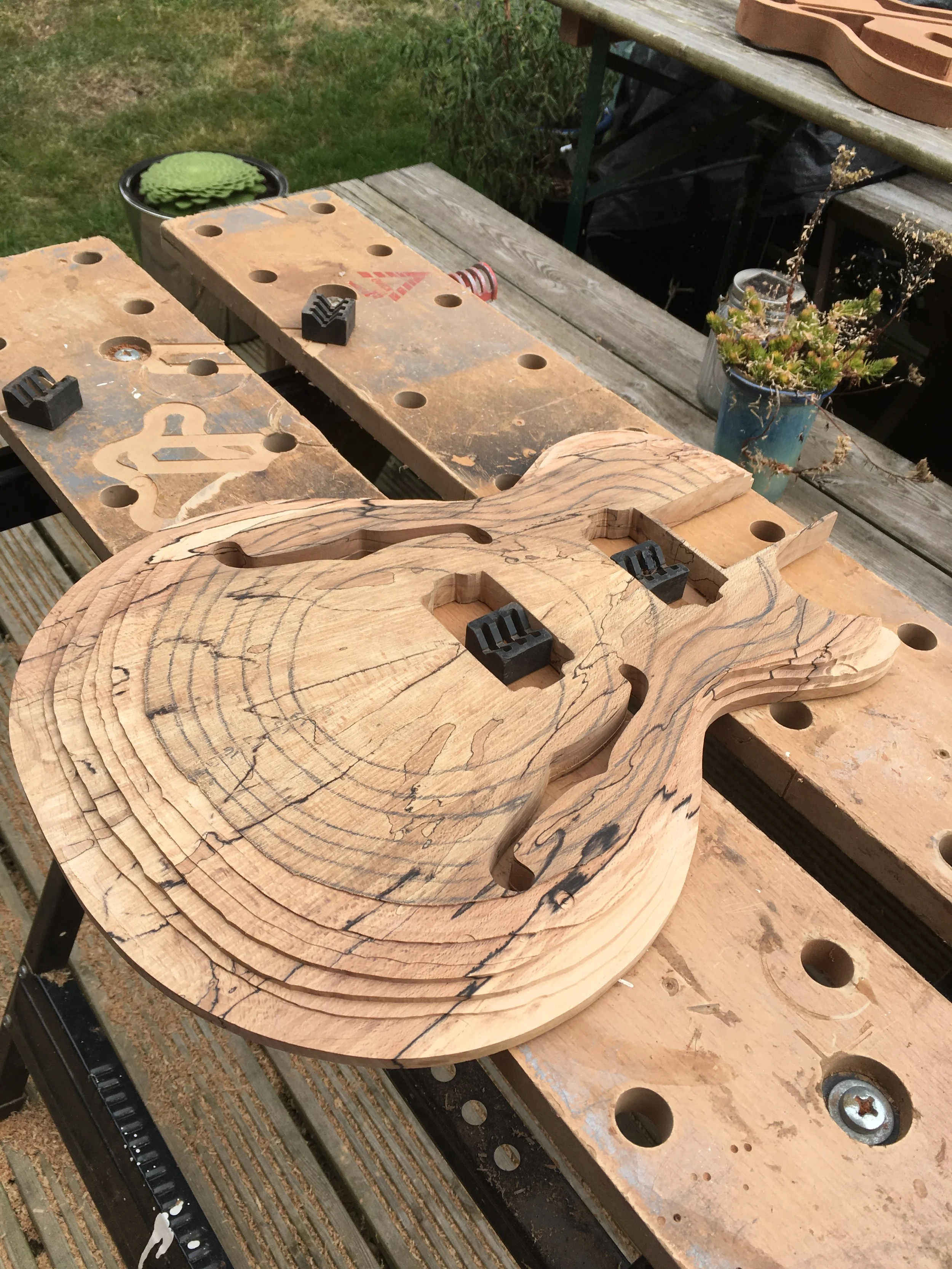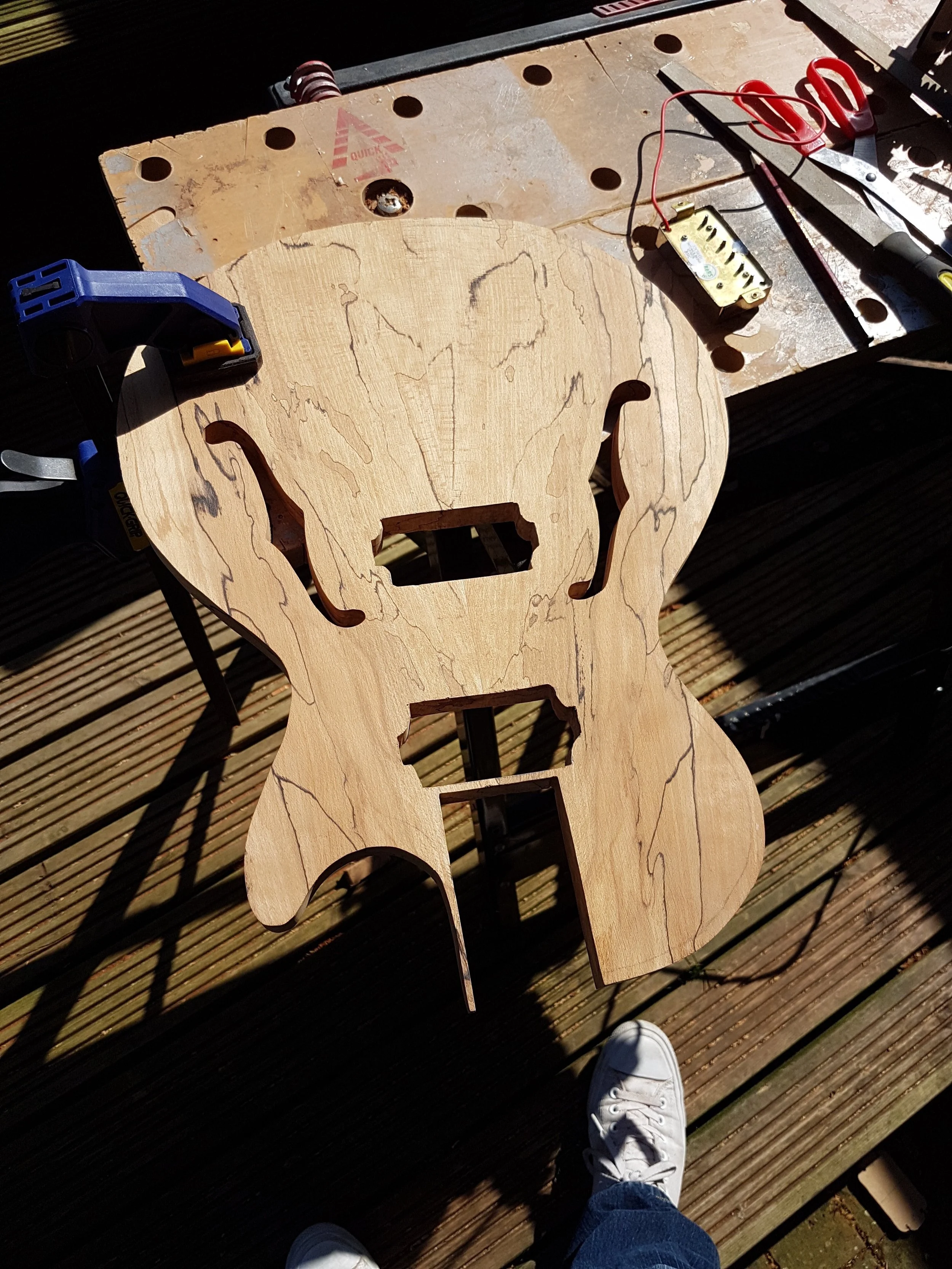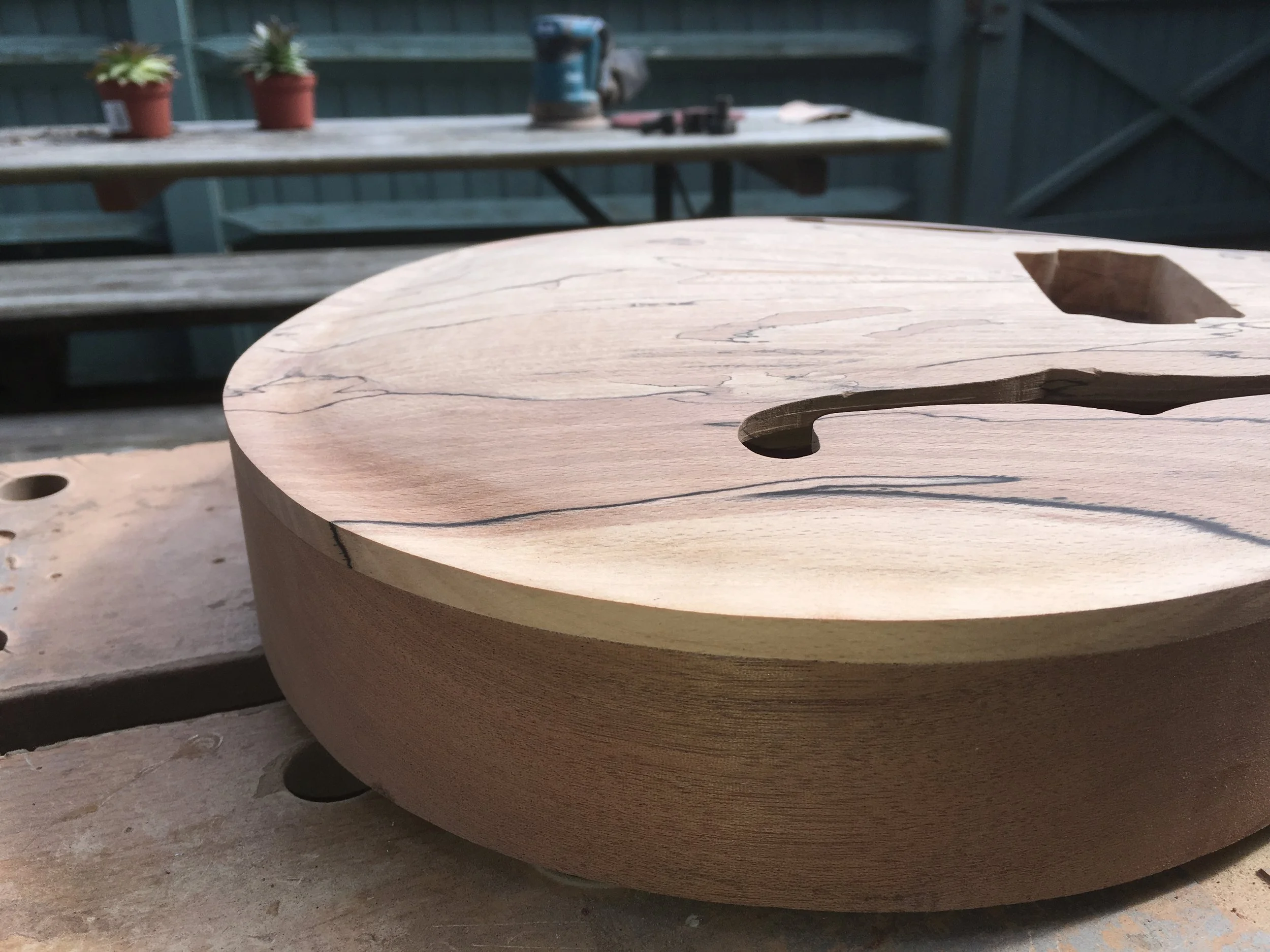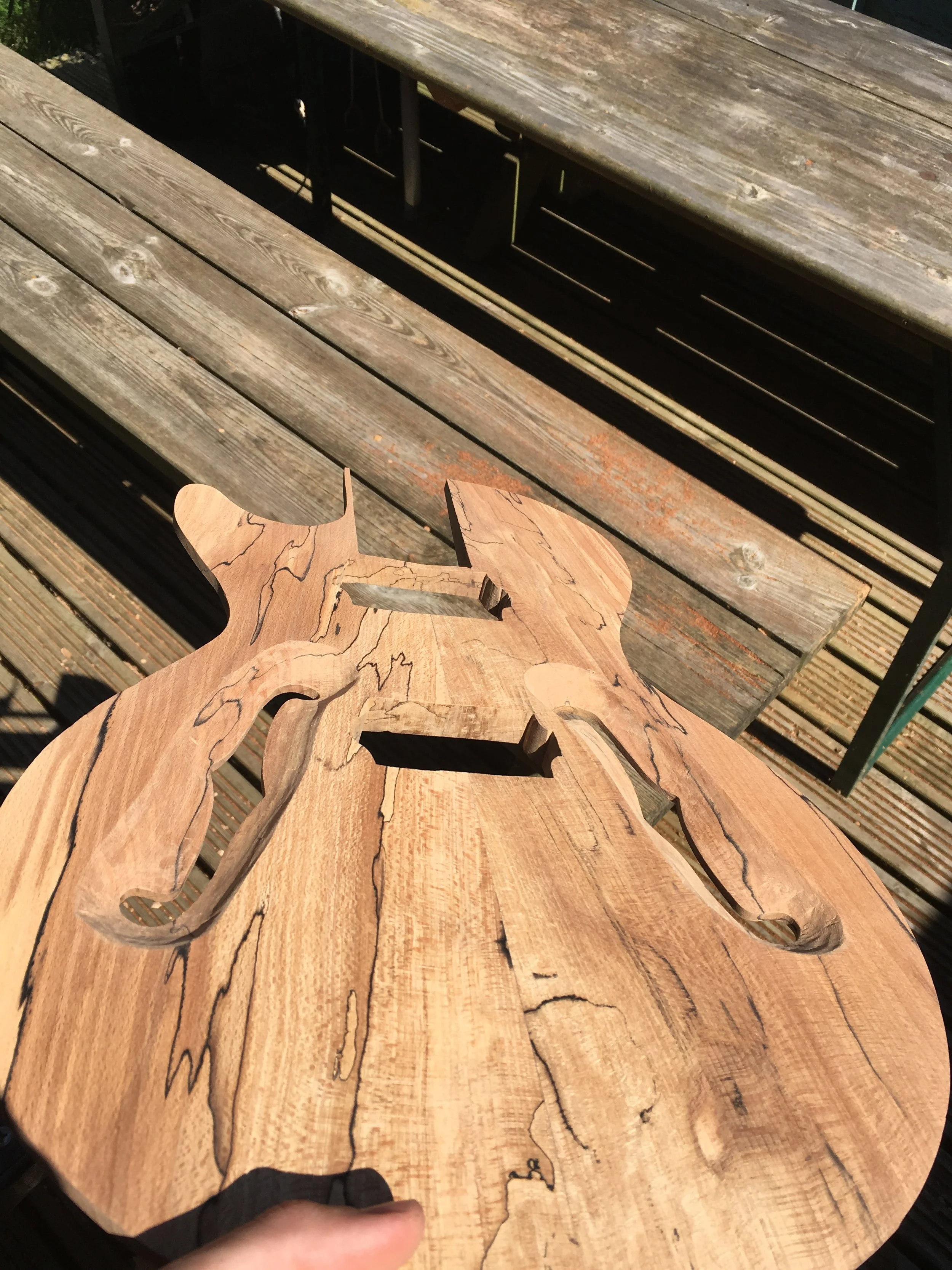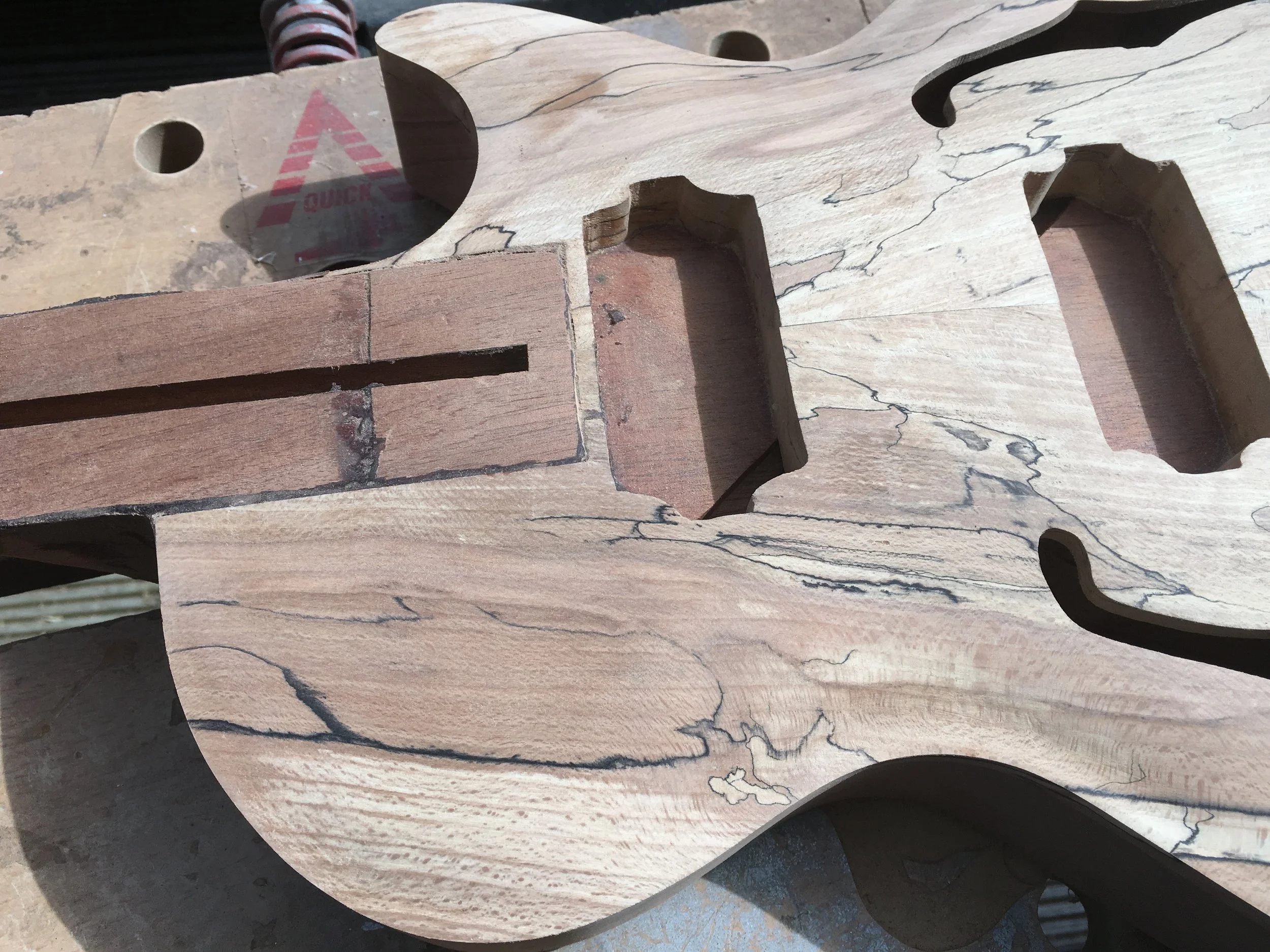 This project began my love of woodworking. Made using a through-body solid mahogany body and neck and a quilted book-matched ash top. The guitar was finished with second-hand Epiphone hardware.