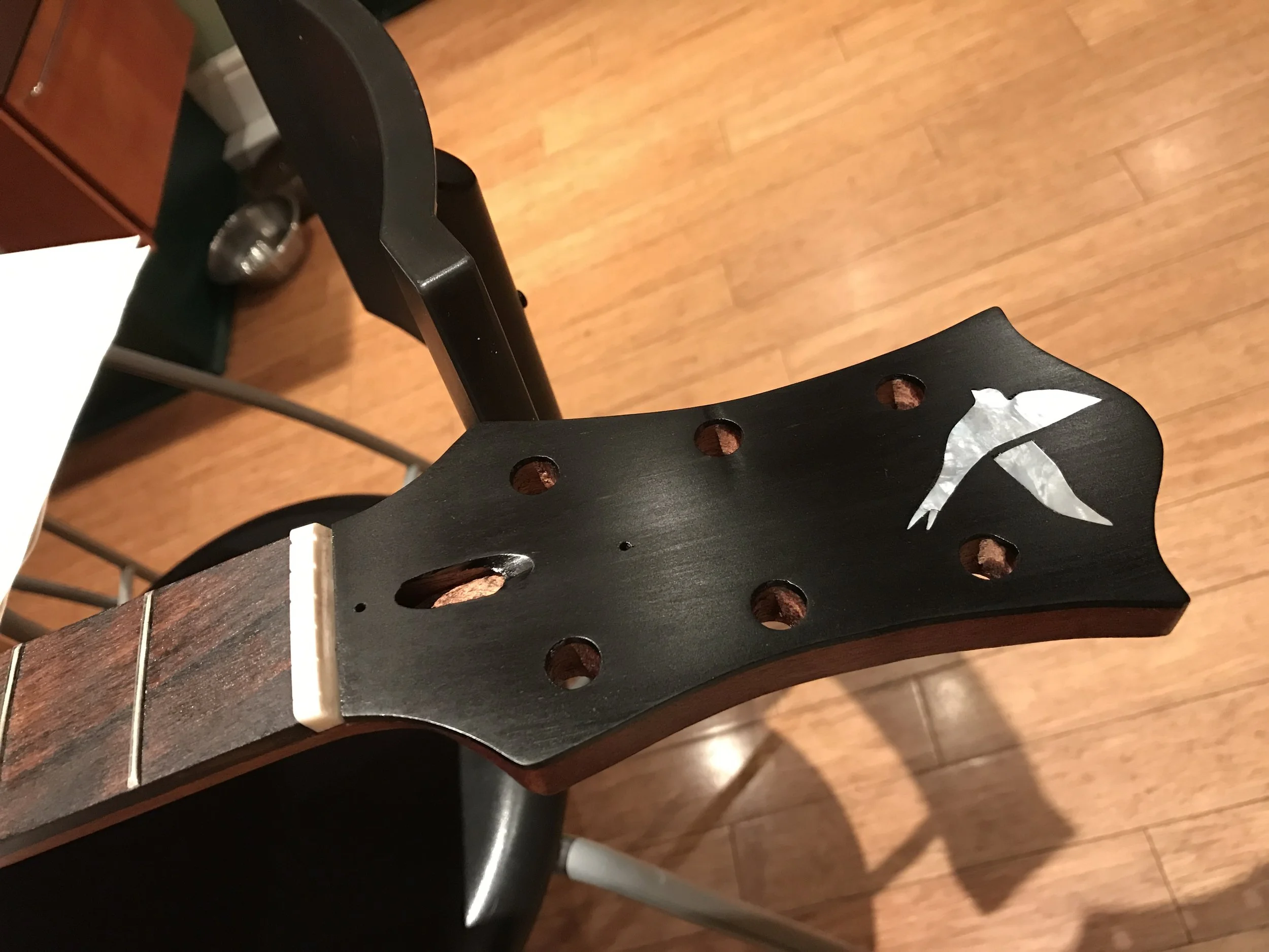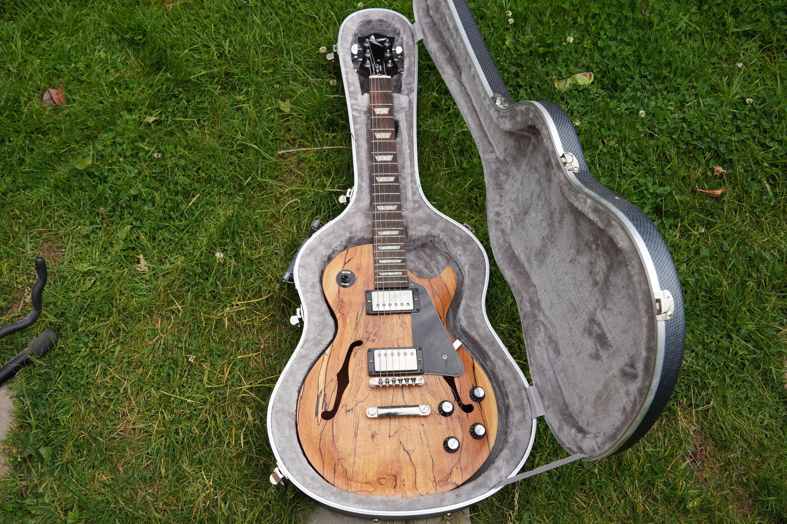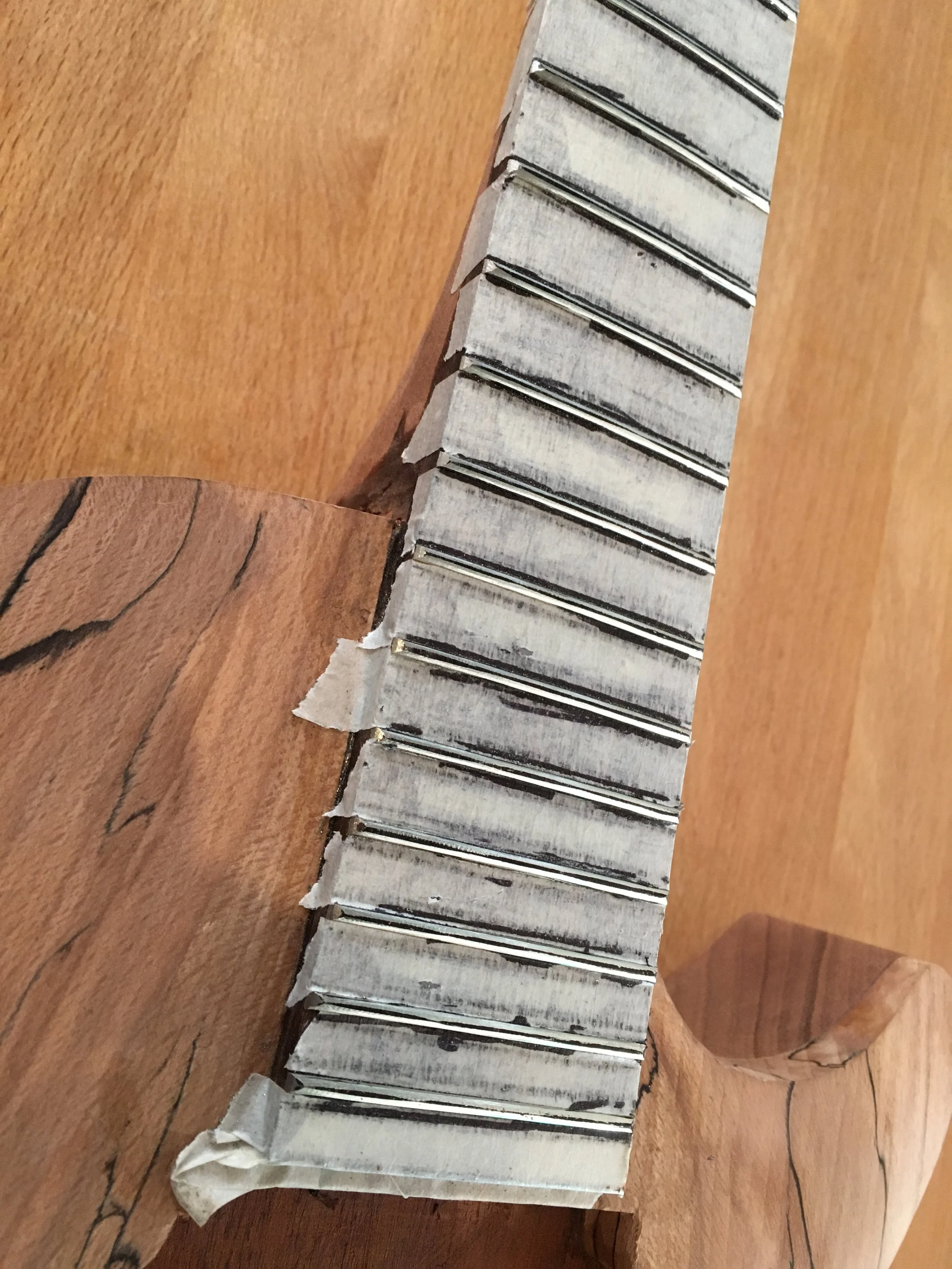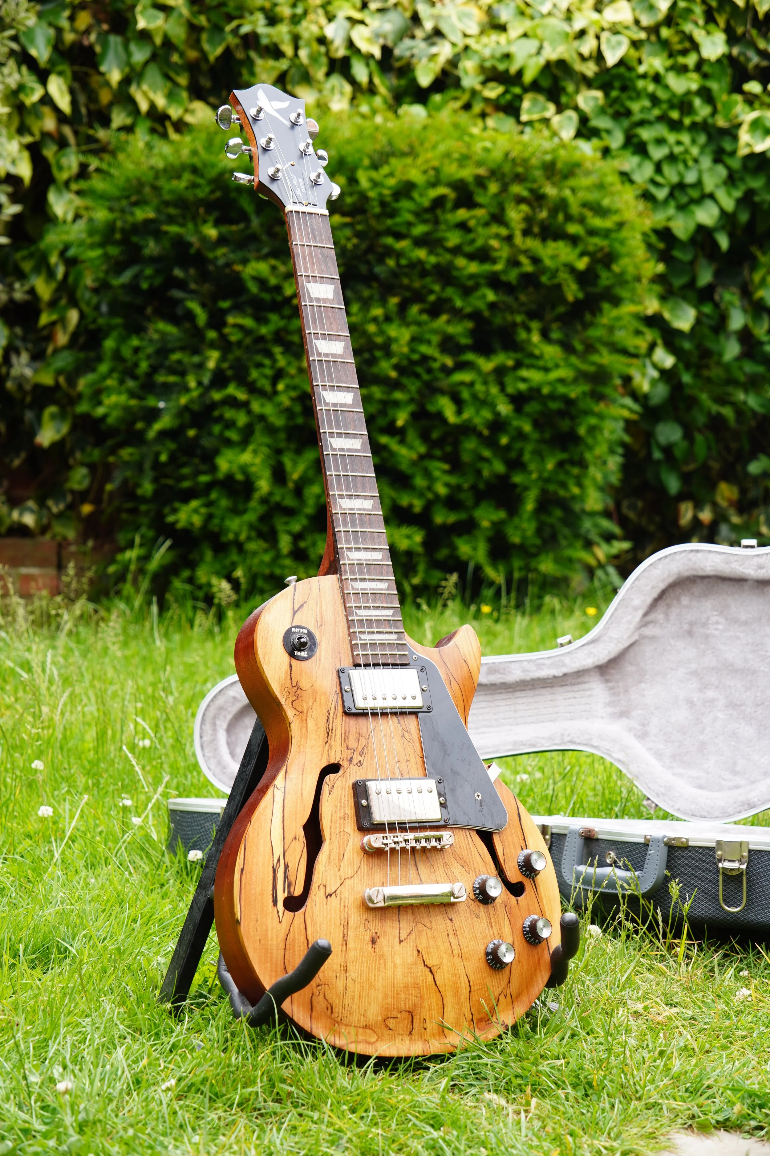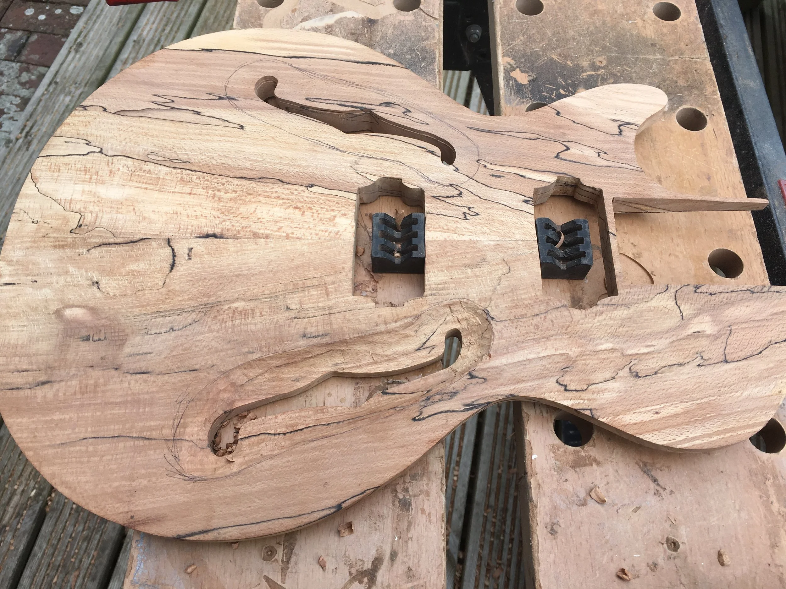This project began my love of woodworking. Made using a through-body solid mahogany body and neck and a quilted book-matched ash top. The guitar was finished with second-hand Epiphone hardware.